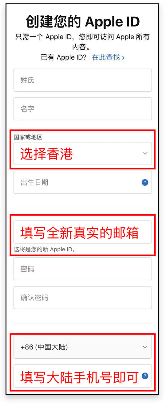 - 邮箱:需要准备一个从未注册过 Apple ID 的 <全新真实>邮箱用来收取验证码;