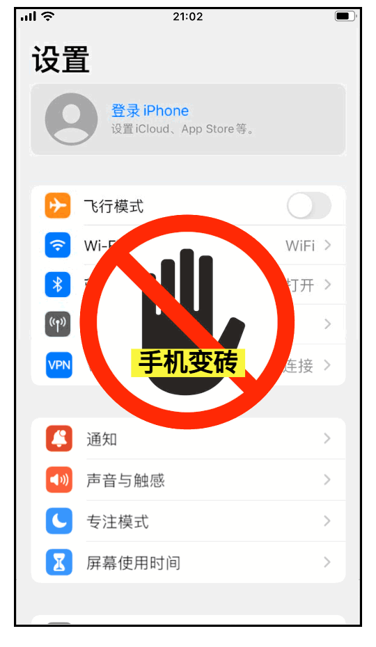 注意! 防止”手机变砖“! 千万别在 iCloud 页面和设置页面登录! 查看