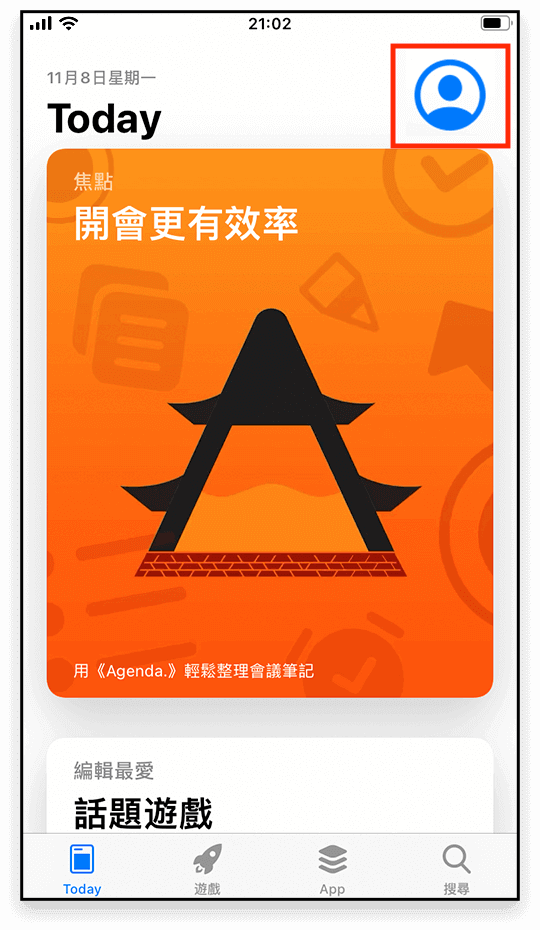 打开 App Store ,点击 <右上角图标>; 千万别在 iCloud 页面和设置页面登录!否则 “手机会变砖”